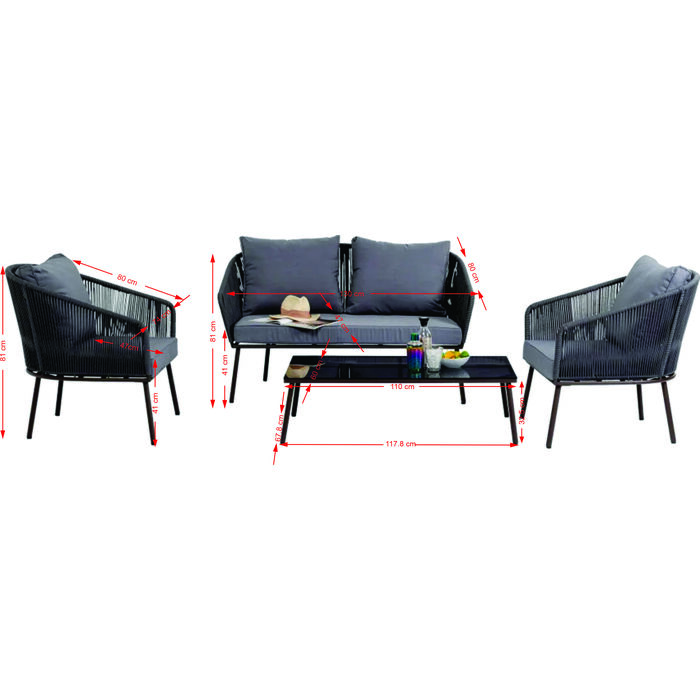 Grupo de asientos procesados de alta calidad para la zona exterior, que combina estética y gran comodidad de asiento. El cristal negro de la mesa de exterior y el revestimiento gris con aspecto de ratán confieren a Elba un aire lujoso. El diseño de estos muebles de salón es tan acertado que los sillones y el sofá también decoran interiores con su aireado diseño.