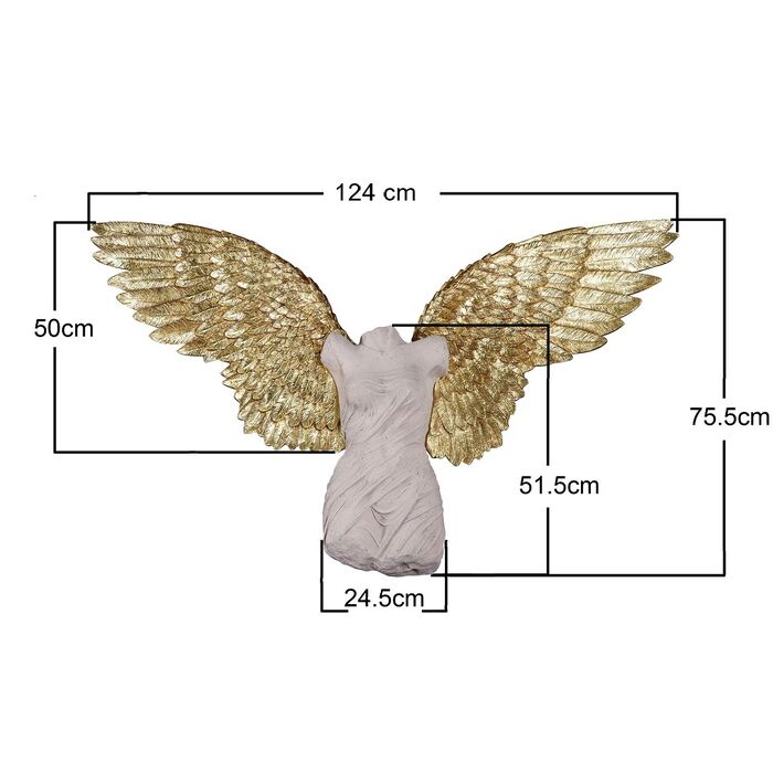 El objeto de pared Ángel de la Guarda atrae todas las miradas. Inspirada en la antigüedad griega, esta decoración de pared representa el cuerpo de una mujer rodeado de alas doradas. Esta impresionante pieza decorativa irradia calma y estilo y encaja armoniosamente en cualquier habitación. Es un ángel protector que da a su hogar un toque especial y atrae las miradas de todos los visitantes. La obra de arte también puede utilizarse como decoración de pared en espacios públicos como hoteles u oficinas. ¡Consigue ya esta decoración única!